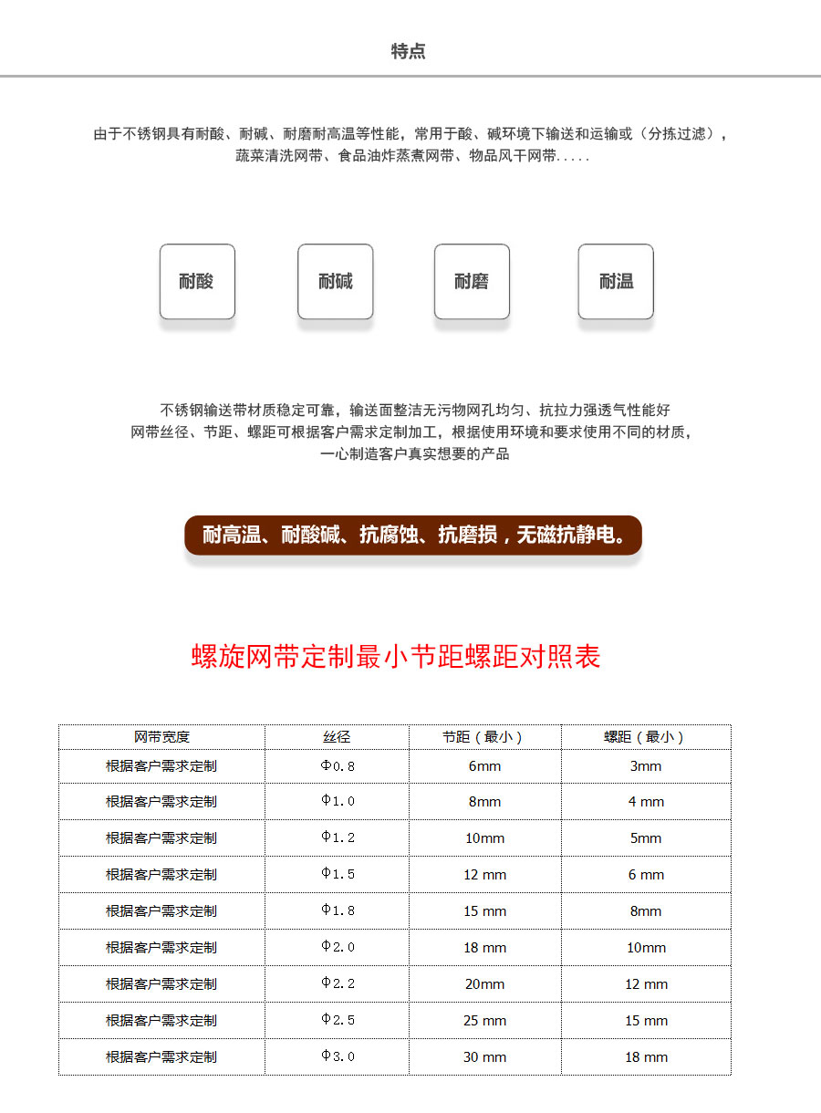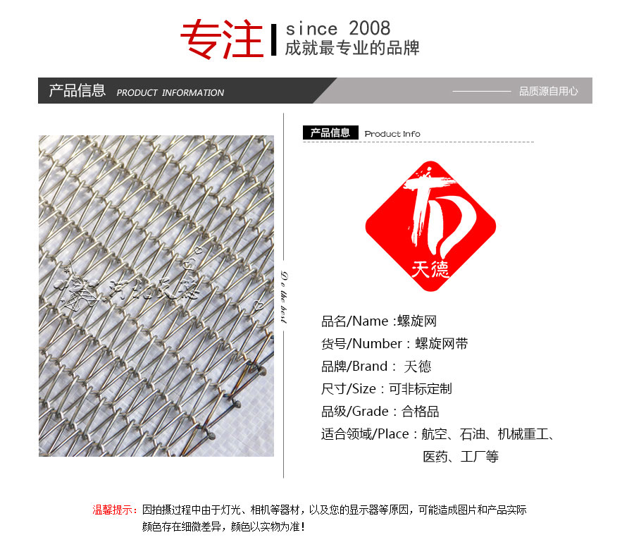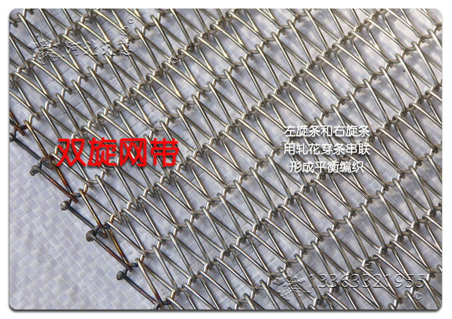 雙旋不銹鋼網(wǎng)帶屬于非標(biāo)準(zhǔn)件,我們將根據(jù)你提供的規(guī)格長寬,材質(zhì),不銹鋼絲線徑,編制結(jié)構(gòu)尺寸,支軸直徑,支軸間距,鏈條型號等數(shù)據(jù)制作.
